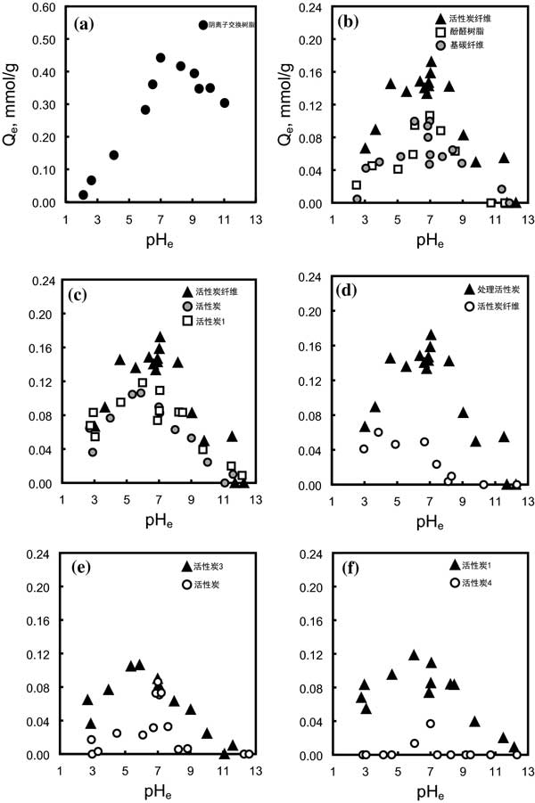 活性炭的陰離子吸附能力通常受溶液pH值的影響。因此,我們使用吸附實驗數據評估了所有pH范圍內砷的潛在吸附位點。pH2-12吸附容量的結果如圖1所示。所有樣品在pH7附近表現出高吸附能力。通常,酸性pH條件下的陰離子吸附能力取決于堿性官能團的數量。作為基本官能團的例子,石墨烯層上的π電子可以吸引一些質子,導致吸附位點略有增加。此外,吡啶氮(N-6)、吡咯氮(N-5)和胺基團在低于特定pH值時會變成帶正電荷的吸附位點,這取決于它們的酸度系數,而季氮始終以帶正電的形式存在。因此,當這些位點根據它們的酸度系數在某些酸性pH范圍內變成正電荷時,它們可以充當陰離子吸附位點。由于這個原因,碳的活化在酸性pH值而不是堿性pH值條件下表現出相對較高的砷吸附能力。然而,H3AsO4的酸度系數值為2.19、6.94和11.5。例如,砷酸鹽的主要種類是H3AsO4和H2AsO4-在pH值2.19。因此,當溶液pH值低于2時,砷的主要種類變為中性。活性炭和被吸附物之間的靜電相互作用變得排斥。此外,由于用鹽酸調節pH,砷酸鹽和氯離子之間的競爭會抑制砷酸鹽的吸附。相反,砷的主要種類是堿性pH范圍內的陰離子。然而,當溶液的堿度大于每個樣品的pHpzc時,碳表面帶負電荷。這些強堿性條件在靜電上不適合陰離子吸附。此外,過量的氫氧根離子也在堿性區域中充當強競爭離子。綜上所述,陰離子吸附在堿性pH范圍內是不利的。