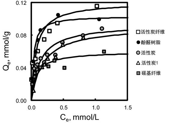 我們在圖2中顯示了連續加熱處理活性炭的朗繆爾吸附等溫線。由于顯示出大吸附容量的pH值較窄,因此我們將平衡pH條件確定為pH6.6-7.0。在此范圍內,大多數經CVD處理的樣品顯示出穩定的吸附能力。決定系數指出朗繆爾等溫線與所有樣品的合適匹配。因此,該結果表明砷吸附可以發生在單層上。總之,該結果支持了砷酸鹽吸附發生在NQ位點、石墨烯層上的π電子質子化以及活性炭的含氧和氮的基本官能團質子化的想法。