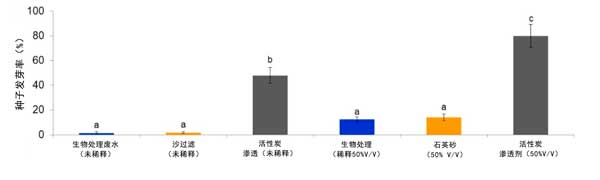 圖3:經生物處理的含殺菌劑流出物(未稀釋或稀釋50%)在通過砂濾器和活性炭吸附柱系統處理前后的發芽指數(GI)值。由相同字母指定的條形在5%的水平上沒有統計差異。
