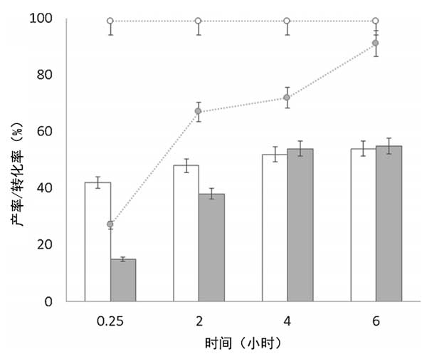 圖1:活性炭載氧化錫(白色條和點)和氧化鋅(灰色條和點)催化劑下果糖到乳酸乙酯的產率(條)和轉化率(點)。