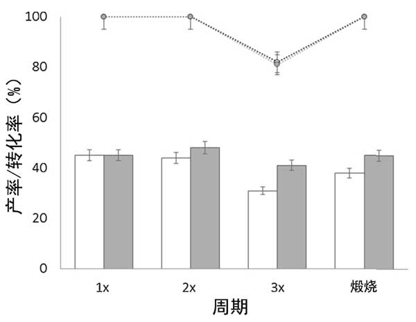 圖2:在160℃的20mL乙醇中從葡萄糖(0.1g)催化劑氧化錫活性炭(白色)和氧化鋅活性炭(灰色)的回收實驗中乳酸乙酯的轉化率(點)和產率(條)。