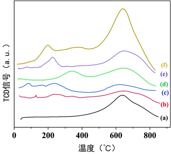 活性炭和載鉑活性炭催化劑的H2-TPR曲線(xiàn)在圖1顯示,它描繪了還原機(jī)制。如圖1a所示,在活性炭的H2-TPR曲線(xiàn)中觀(guān)察到630℃的峰,這歸因于活性炭的表面官能團(tuán)。與活性炭相比,活性炭載鉑催化劑的H2-TPR曲線(xiàn)(圖1b)顯示了在240℃和340℃處的峰值,這是由Pt-O-Pt和Pt-O-C的還原產(chǎn)生的,分別進(jìn)一步證明了活性炭載鉑催化劑的成功合成。在硫酸活化活性炭(圖1c)、氨基丙基三乙氧基硅烷活化(圖1d)的H2-TPR曲線(xiàn)中也觀(guān)察到了Pt-O-Pt或Pt-O-C的還原峰)、氧化氫活化(圖1e)和硝酸活化(圖1f),它們可以改善金屬物種的分散。此外,活性炭載鉑基催化劑曲線(xiàn)中的還原峰小于400℃,這表明鉑在甲基環(huán)己烷脫氫之前催化劑中處于金屬狀態(tài)。