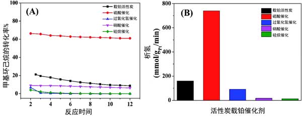 圖2:(A)甲基環(huán)己烷脫氫為甲苯的轉(zhuǎn)化曲線(xiàn)和(B)活性炭載鉑催化劑上的析氫直方圖。