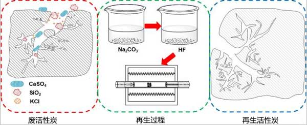 活性炭在燒結(jié)煙氣處理后的再生,采用了Na2CO3溶液、HF溶液和CO2的新型連續(xù)處理方法可以有效地從燒結(jié)煙氣凈化過程中再生廢活性炭。無機化合物如CaSO4和SiO2以及KCl的沉積導(dǎo)致活性炭失活,Na2CO3溶液可以將CaSO4轉(zhuǎn)化為CaCO3并去除水溶性化合物,如KCl。硫轉(zhuǎn)化率首先顯著增加,然后隨著Na2CO3濃度的增加變化減慢。當(dāng)Na2CO3濃度為0.5mol/L時,硫轉(zhuǎn)化率自由基高達94.6%。另外在各種溶劑濃度和溫度都達到較好的水平,總體再生效率可達111%