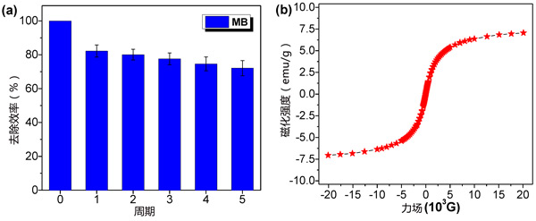 首先,研究了活性炭含量對(duì)磁性吸附劑吸附能力的影響。為了比較,活性炭的吸附容量也在相同條件下確定。在較高的初始染料濃度(5.0mM)下,磁性活性炭對(duì)MB和MO的飽和吸附能力明顯增加,隨著活性炭含量的增加。但是對(duì)于實(shí)際的吸附應(yīng)用,非常需要具有良好可重復(fù)使用性的吸附劑。我們通過使用乙醇作為洗脫劑來(lái)評(píng)估吸附MB的磁性活性炭的可重復(fù)使用性。如圖3a所示,解吸的磁性活性炭的去除效率隨著重復(fù)使用次數(shù)的增加而降低。與原來(lái)的去除效率相比,經(jīng)過5個(gè)解吸-吸附循環(huán)后,去除效率保持在72.1%左右。盡管如此,再生的活性炭的吸附能力仍然比較高,高于傳統(tǒng)的磁性吸附劑。此外,即使經(jīng)過5次再生吸附循環(huán)后,磁性活性炭仍表現(xiàn)出與新制備的相似的飽和磁化強(qiáng)度值(圖3b),表明這次的新型吸附劑具有良好的結(jié)構(gòu)穩(wěn)定性。