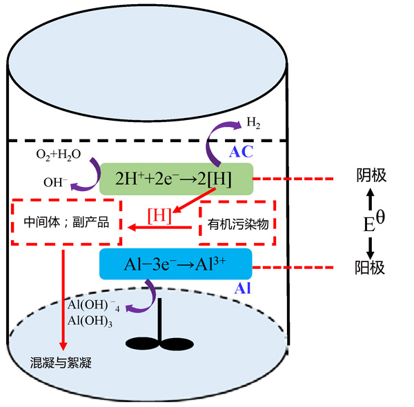 根據(jù)實際工況,提出了一種可行的活性炭載鋁微電解工藝分解水生環(huán)境中有機污染物的反應(yīng)機理(圖2)。由于其高吸附容量和電導(dǎo)率,活性炭被用作陰極保護。在陽極(鋁廢料),由鋁提供的電子通過微型原電池轉(zhuǎn)移到陰極(活性炭),吸附在陰極表面的有機污染物受到這些釋放的電子的攻擊。水電離產(chǎn)生的H+在陰極獲得電子并產(chǎn)生具有強化學(xué)反應(yīng)性的活性氫[H]或H2,和活性氫[H]·可以部分降解有機污染物。此外,Al失去三個電子形成鋁離子(Al3+)。然后,鋁離子沉淀形成氫氧化鋁(Al(OH)3、Al(OH)-4等)。作為有利的絮凝劑,這些氫氧化鋁可以有效去除廢水中的有機污染物。難降解污染物在活性炭載鋁微電解工藝的輔助下被分解為小分子中間體,也可以通過氫氧化鋁絮狀污泥的絮凝共沉淀來消除。換言之,與活性炭載鋁微電解工藝相關(guān)的許多協(xié)同效應(yīng)可以有效地分解水環(huán)境中的有機污染物。