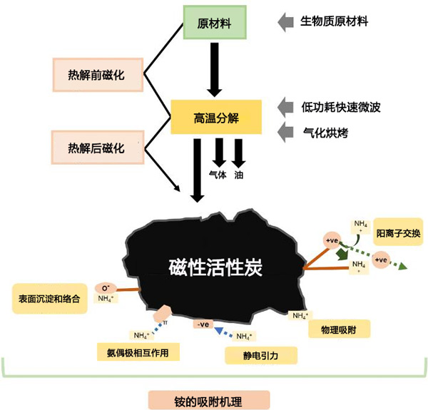 圖1:活性炭生產概述,包括可能的原料和熱解方法的非詳盡示例,以及可能發生的銨吸附機制的范圍。
