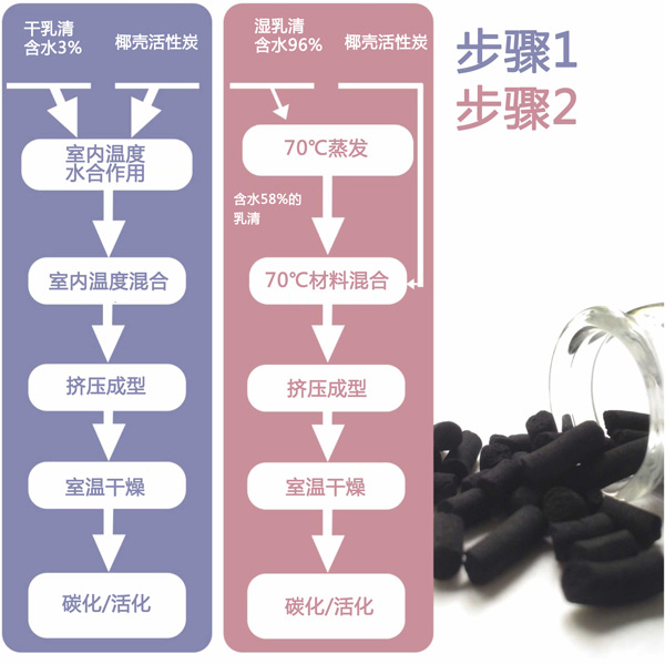 圖1:使用乳清作為粘合劑制備碳化和活性炭顆粒的路線示意圖。
