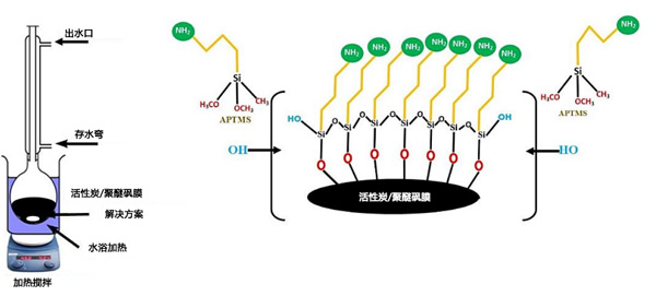 為了改性活性炭的表面,將15g非常細(xì)的干燥活性炭粉末與300mL甲苯和2mL氨丙基三甲氧基硅烷(APTMS)溶液在磁力攪拌下在40℃惰性環(huán)境下混合24小時。圖1表示實驗裝置的示意圖。使用實驗室旋轉(zhuǎn)蒸發(fā)儀去除溶劑。用甲苯和丙酮進一步洗滌所得的APTMS活性炭,然后在60℃下真空干燥6小時。這種干燥的活性炭被稱為改性活性炭,由表面上的胺官能團組成。改性活性炭在干燥條件下儲存以用于后續(xù)的實驗工作。