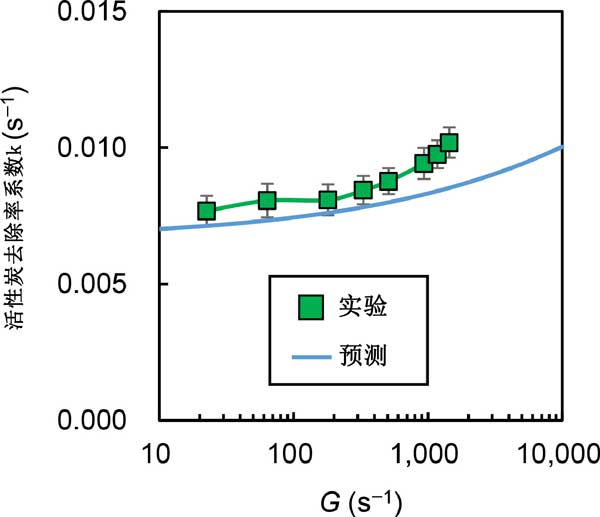 我們研究了混合強(qiáng)度對去除率系數(shù)(k)的影響(圖1)。我們繪制了實(shí)驗(yàn)數(shù)據(jù),實(shí)線顯示了方程式預(yù)測的值。實(shí)驗(yàn)結(jié)果和預(yù)測結(jié)果都表明,去除率系數(shù)隨著混合強(qiáng)度的增加而增加,但在G>1000s-1的范圍內(nèi),實(shí)驗(yàn)結(jié)果的增加率變得更陡峭,偏離預(yù)測的速率系數(shù)值。我們假設(shè)偏差背后的急劇增加是由于活性炭顆粒在高混合強(qiáng)度下的分解(在給炭時輕度聚集)。這些預(yù)測是在假設(shè)活性炭顆粒的尺寸(部分聚集在原料懸浮液中)在給炭后保持不變的情況下做出的,因?yàn)樵活w粒尺寸測量是不可能的。如果這個假設(shè)是正確的,那么去除率系數(shù)隨著混合強(qiáng)度的急劇增加,在高G對于在給炭時已經(jīng)處于分散狀態(tài)的活性炭顆粒,不應(yīng)觀察到-值范圍。為了驗(yàn)證這一假設(shè),我們使用了非聚集活性炭,其粒徑在分散處理前后沒有變化,我們在不同的混合強(qiáng)度。我們沒有觀察到隨著活性炭混合強(qiáng)度的增加,去除率系數(shù)的急劇增加,強(qiáng)烈表明觀察到的活性炭的急劇增加是由于高混合條件下的顆粒分解。