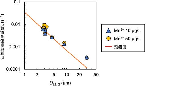 我們將Mn2+去除率系數(shù)(k)與活性炭的粒徑進(jìn)行了比較(圖3)。我們使用源自相同活性炭的九種尺寸的碳顆粒繪制了實(shí)驗(yàn)數(shù)據(jù),以便與方程式的預(yù)測進(jìn)行比較。實(shí)驗(yàn)值和預(yù)測值幾乎一致,并且在雙對數(shù)圖上都顯示出線性關(guān)系。仔細(xì)觀察發(fā)現(xiàn),預(yù)測值的斜率比實(shí)驗(yàn)值更陡,在較大顆粒范圍內(nèi),實(shí)驗(yàn)值略大于預(yù)測值。這可能是由于顆粒形狀或表面性質(zhì)的任何差異:我們假設(shè)了一系列參數(shù)值,包括球形值,這些預(yù)測與顆粒大小無關(guān),但在實(shí)際的活性炭中,這些值可能隨顆粒大小而變化。總體而言,活性炭的粒徑對Mn2+去除性能有很大影響。