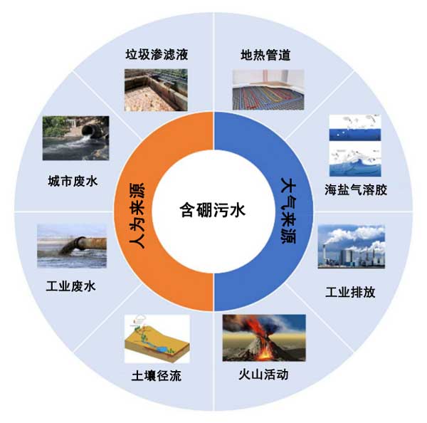 硼通過礦物提取、煤炭燃燒、含硼砂產生的清潔劑的廢水排放、硼肥等應用以及硼化物處理的木材的副燃燒進入水環境(圖1)。由于人類活動的影響,已經觀察到地下水和地表水中的硼濃度增加。硼在水生環境中的存在會對環境造成很大的影響。但從工業設施對硼的需求增加,水資源中硼的含量增加,水質標準變得更加嚴格。所以需要去除水中的硼來修復環境。脫硼方法包括膜分離、活性炭吸附、(電)凝聚和沉淀、萃取以及這些方法的組合。