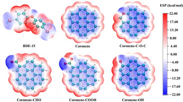 為進一步研究PBDEs與活性炭之間的微觀相互作用機制,通過計算化學研究了活性炭結構模型與BDE-15之間的弱相互作用。根據表征結果,構建了以暈苯為基本結構的純碳結構模型,以及羧基、羥基、醛和醚取代的結構模型,模擬了活性炭的不飽和碳結構和含氧官能團結構。BDE-15和五種活性炭結構模型的靜電勢如圖5所示。BDE-15在其溴原子和氧原子附近顯示出負靜電勢,而在其他區域,尤其是在其氫原子附近,則顯示出正靜電勢。這是因為溴原子和氧原子的電負性大于碳原子,而氫原子的電負性最小。在Coronene的結構中,所有的碳原子都表現出負的靜電勢特征,而氫原子則表現出正的靜電勢特征。含氧官能團的引入增加了基團附近的正靜電勢面積和負靜電勢面積,屬于結構中極性最強的區域。根據正負靜電勢相互吸引的原理,BDE-15和活性炭結構模型可以形成多種復合構型。可以推測,基團附近存在強靜電勢區使得BDE-15更容易與基團結合。