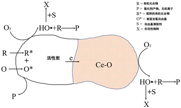 圖1:活性炭二氧化鈰催化的臭氧化過程中發生的主要反應途徑示意圖。