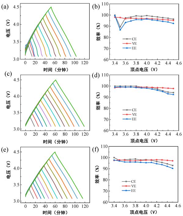 圖1:活性炭鋰半電池在不同鋰離子電解質中從pzc到各種頂點電壓的恒電流充放電曲線:(a)EDD,(c)EPD,和(e)PCE;相應的EE、CE和VE值作為頂點電壓的函數:(b)EDD,(d)EPD,和(f)PCE。