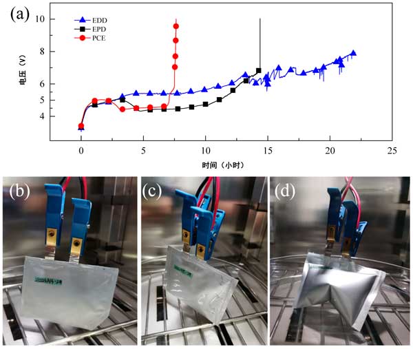 圖2:過充至10.0V的活性炭鋰半電池:(a)電壓隨時間變化曲線,以及使用不同電解質過充過程后半電池的照片:(b)EPD,(c)PCE和(d)EDD。