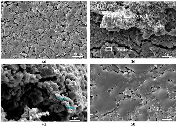 圖3:(a)交流電極和來自活性炭鋰半電池的交流電極的SEM圖像充電到10.0V的高電壓,具有不同的電解質(b、c)PCE,(d)EPD。