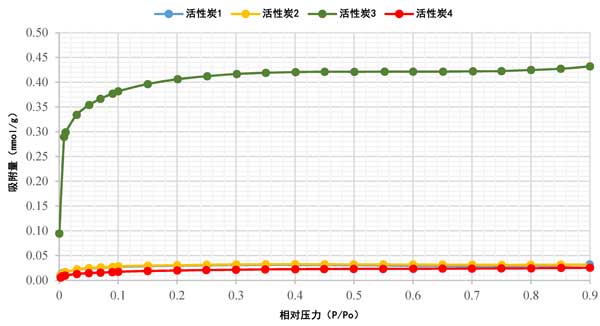 活性炭的吸附等溫線已使用氮(N2)吸附分析技術(一種標準方法)進行了研究。圖2顯示了活性炭在77K時的N2吸附等溫線,該等溫線被發(fā)現(xiàn)為I型等溫線。N2吸附在低相對壓力范圍內(nèi)的快速上升證實了所有樣品都存在小孢子,如圖2所示。很明顯,活性炭4具有最低的N2吸附,而活性炭1和活性炭2的吸附等溫線重疊,活性炭3具有最高的N2吸附。數(shù)據(jù)的這種可變性可能歸因于所使用的不同前體材料。此外,除活性炭3外,活性炭的大部分孔隙體積都填充在P/Po≈0.1以下。對于活性炭3,孔體積填充低于P/Po≈0.3。在初始增加到0.1后,等溫線逐漸彎曲,表明進一步吸附的增量較小。隨著相對壓力的增加,所有樣品的吸附幾乎呈水平狀態(tài),表明已經(jīng)達到飽和。
