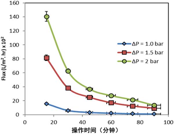 圖3顯示,在運行90分鐘后,在2bar的運行壓差下,達到的最高通量值。基于這些值,已知滲透通量值降低。發生這種情況是由于膜壁上不需要的溶解污染物顆粒堵塞,這些顆粒大于膜孔。這些顆粒堵塞膜表面的孔或卡在孔內。這種膜壁堵塞與濃差極化現象密切相關,在這種現象中,膜壁表面的污染物濃度較高,導致較低的流體流量,而通過膜的污染物最少。也可以在圖3中看到滲透通量隨著較高的操作壓力而增加,這對應于膜操作的驅動力。施加到流過膜的進料流的壓力將導致與膜孔相比顆粒尺寸更小的流體流可以通過膜,而較大的顆粒,例如污染物,將被保留。Fe、Mn、Zn、NH3–N、PO4各污染物從初始濃度1.38、1.30、0.92、0.90、0.93mg/L的總截留率分析結果分別為92.03、97.08、99.67、84.56、87.10%。這些分析結果顯示了這項工作的可喜成果,其中每項總拒絕率都在80%以上。