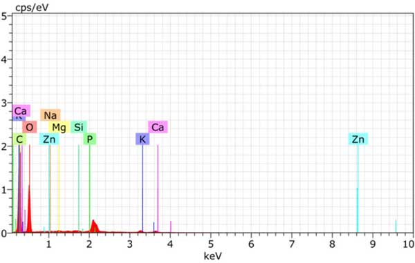 揮發物含量直接在自動近似分析儀中測量。當爐油樣品燃燒完全時,不可燃殘留物通過灰分含量反映出來。在此過程中使用可承受300至400℃溫度的高溫馬弗爐。在空氣中存在氧氣的情況下,某些物質(如水和其他揮發性元素)會燃燒,而其他物質(包括有機分子)會蒸發。通過比較灰化前后樣品的重量可以計算出樣品中的灰分含量。固定碳的計算方法是從100中減去揮發性物質的百分比、水分含量和灰分含量。活性炭的堆積密度是借助密度計。用能量色散X射線分析法分析活性炭的化學成分圖2。活性炭的EDAX分析具有由C、O、Zn等組成的元素。