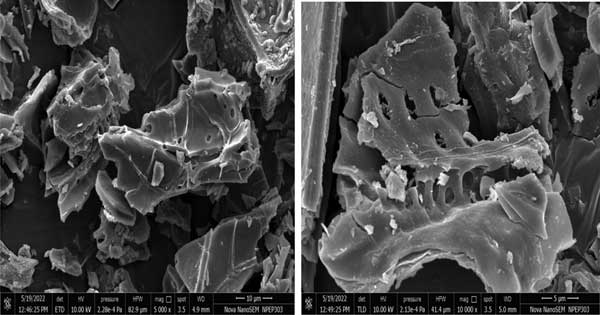 使用掃描電子顯微鏡分析獲得的活性炭的孔結構。SEM設備具有超高分辨率低電壓成像和獨特的低真空能力。SEM圖像是在15kV時以1nm、1kV時1.4nm、3kV時1.8nm和30Pa的不同分辨率拍攝的。觀察活性炭的表面物理形態是通過使用SEM完成的技術。圖3顯示活性炭的SEM圖像。這表明活性炭的外表面具有均勻開放的大孔。此外,活性炭的表面是高度多孔的,其特點是不均勻。同樣清楚的是,活性炭在其外表面具有微孔和空腔,暗區位于該處。經受碳化后,活性炭由于ZnCl2的蒸發而產生空隙(稱為氣孔)。可以將這些孔視為通向微孔網絡的通道。