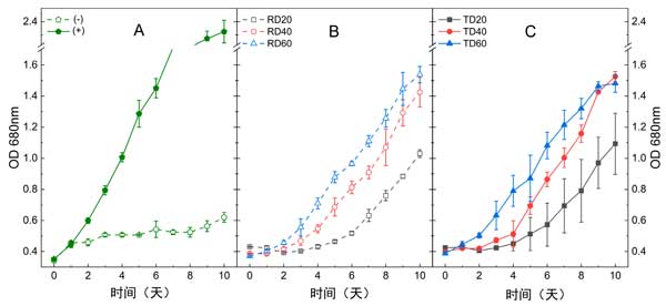 厭氧消化物中存在的大量和微量營(yíng)養(yǎng)素的多樣性可能有利于藍(lán)藻代謝。即使活性炭預(yù)處理顯著降低了幾個(gè)參數(shù),包括COD、濁度和苯酚含量,原料(4405mg/L)和預(yù)處理消化物(4220mg/L)的銨濃度仍然高于藍(lán)藻螺旋藻支持的閾值濃度(100–150毫克/升)。在這種情況下,使用以三種不同稀釋率稀釋的原始和預(yù)處理消化物進(jìn)行了一系列藍(lán)藻毒性測(cè)定:20×、40×和60×。未稀釋的消化物,無(wú)論是否用活性炭處理,都沒(méi)有在本實(shí)驗(yàn)中進(jìn)行測(cè)試,因?yàn)槌醪脚囵B(yǎng)分析表明它們對(duì)培養(yǎng)物毒性太大(數(shù)據(jù)未顯示)。因此,該實(shí)驗(yàn)的目的是比較以不同稀釋率稀釋的兩種消化物以及兩個(gè)對(duì)照組之間的生長(zhǎng)性能。連續(xù)測(cè)量680nm處的OD超過(guò)10天,以評(píng)估所有條件下的生長(zhǎng)情況。在三種不同稀釋因子下測(cè)試的原始消化物(RD)和處理過(guò)的消化物(TD)條件下,觀察到類似生長(zhǎng)趨勢(shì)(圖2A、B)。當(dāng)增加原始和預(yù)處理消化物的培養(yǎng)基稀釋倍數(shù)時(shí),會(huì)產(chǎn)生更高的生長(zhǎng)反應(yīng)。同樣,滯后期受原始消化物和預(yù)處理消化物的稀釋因子的影響,觀察到的滯后期越長(zhǎng),消化物越濃縮。例如,稀釋20倍和40倍的未處理消化物的滯后期分別持續(xù)4天和2天。在本研究中,根據(jù)稀釋倍數(shù)和預(yù)處理?xiàng)l件,使用221和71mg/L之間的初始銨氮(NH4+-N)濃度,鈍頂藻能夠增殖。一般而言,原始消化物和預(yù)處理消化物的更高稀釋度產(chǎn)生更高的生長(zhǎng)。
