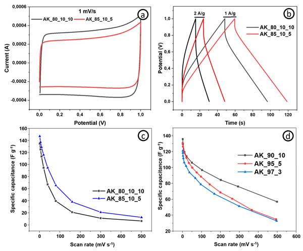 活性炭電極表現(xiàn)出比常規(guī)樣品更好的比電容和能量密度(相同功率密度下的最大能量密度為4.8vs.4.4Wh/kg-1),因?yàn)橛懈嗟幕钚圆牧希娮琛⒈堵誓芰?圖3c)和功率密度—這取決于電極的導(dǎo)電能力(基于導(dǎo)電添加劑含量)。圖3d顯示了具有不同活性炭和碳納米管含量的電極在不同掃描速率下的比電容。碳納米管含量為10%的電極在1mV/s-1下實(shí)現(xiàn)了137F/g-1的最高比電容。從圖中可以清楚地看出,就比電容而言,活性炭和碳納米管的最佳比例為90:10。綜上所述,我們可以得出這樣的結(jié)論:對于超級電容器的自支撐電極,活性成分、結(jié)合成分和導(dǎo)電成分的最佳比例為85:10:5。可以進(jìn)一步評估具有這種含有源自其他生物前體的活性材料的組合物的電極的電化學(xué)性能。