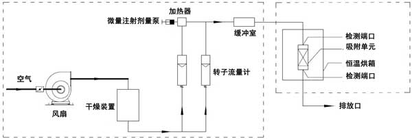 動態吸附實驗在室溫(25℃)下進行。實驗裝置由氣體分配系統和吸附系統兩部分組成。吸附系統由恒溫箱和吸附單元組成。檢測口位于吸附系統之前和之后。動態法測定活性炭對脈沖負荷緩沖性能的裝置如圖1所示。本實驗以乙醇或二甲苯為單一檢測對象。氣體分配系統包括風扇、干燥裝置、轉子流量計、微注射計量泵、加熱器和緩沖室。使用FT-IR傅里葉氣體分析儀作為測量設備。在氣體分配系統中,在短時間內(2分鐘和5分鐘),微注射計量泵的注射量迅速增加到原始體積的預定倍數(10倍和20倍),以產生脈沖負載。在吸附系統中,吸附單元內放置活性炭。吸附單元的直徑為31mm。活性炭的填充高度分別為2cm、4cm、6cm、8cm。將吸附裝置置于恒溫箱內。吸附劑和吸附物的入口空氣保持在室溫。進行了吸附劑在室溫下吸附吸附質的脈沖加載實驗。潔凈空氣通過干燥裝置后,利用轉子流量計將其按特定比例分成兩個通道。通過微注射泵將特定濃度的乙醇或二甲苯氣體注射到氣體中。另一種氣體用作稀釋氣體。兩種氣體流入緩沖室,完全混合后進入恒溫箱。穩定的氣體按照實驗設定的濃度、流量和溫度進入吸附單元。在通過吸附單元之前和之后測量乙醇或二甲苯的濃度。