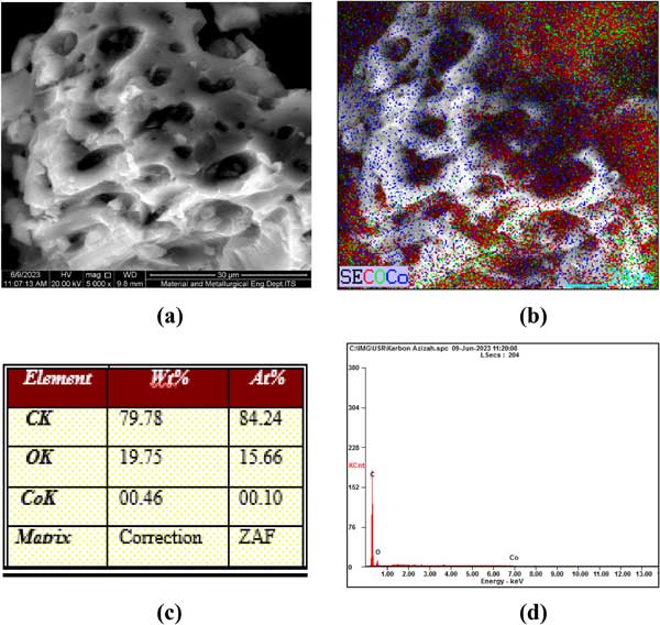此外,EDX分析結果表明碳含量高(C=79.78%)和化學結合氧(O=19.75%),如圖1和2所示。5c和5d。還存在少量鈷(Co=0.46%),它是在碳化過程中出現的并且沒有得到最佳轉化,并且樣品洗滌過程也不是最佳的。下圖中,顯示了樣品的元素分布圖,其中碳為紅色,氧為綠色,鈷為藍色,分布均勻,如圖3b所示。這會影響吸附孔隙結構的形成。